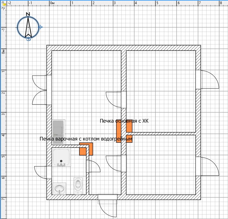 На плане я нарисовал рыжим цветом две печки. С основной - "Печка основная с ХК" вроде с ней попроще должно быть, вот с той, что условно обозвал "Печка варочная с котлом водогрейным" есть неясности.