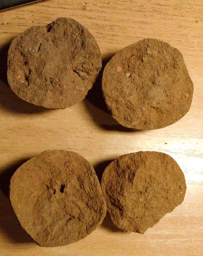 Имею глину с двух мест: 1-я с места, где местные берут для печей (попадаются всякие корешки), 2-я с раскопок по прокладке газопровода (попадаются камушки). Испытывал обе всеми описанными в интернете способами. Вроде получается глины (а они примерно одинаковые) чуть жирнее нормальных. Например при растворении в воде осадок песка примерно 1/3. На фото то, что произошло с высушенными шариками из глины при падении с ~1 метра на бетон. На деревяшку не разбиваются.