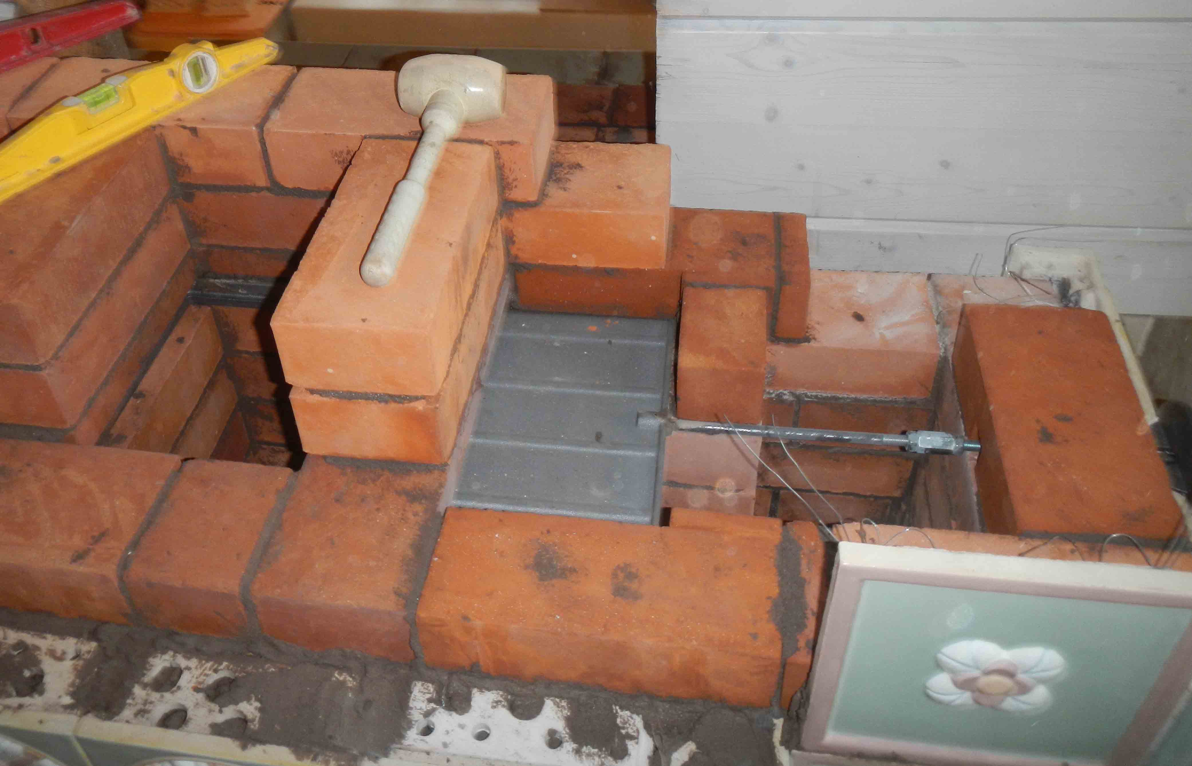 Строительство печи велось параллельно с монтажем изразцовой облицовки. Для крепления изразцов в кладку использовали поводки из нержавеющей проволоки толщиной 0.8мм и костыли для которых чудесным образом подошли тяги для потолочных подвесов. Румпа изразцов заполнялась глинопесчаным раствором.