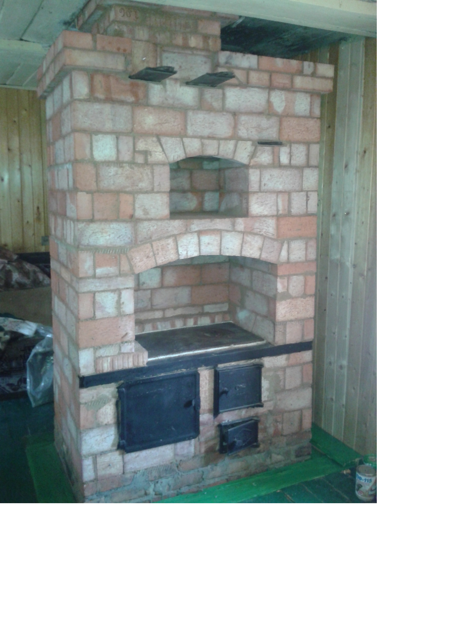 Собственно, переложил заново лопнувшую печь на даче. Там такая конструкция называется "монашка". Добавил немного отсебятины - футеровку топливника, арочки вместо уголков, полки из кирпича по уголку вместо листа железа, второй ряд перекрыши, ну и перекрытие всего что можно и нельзя спиленными на клин кирпичами вместо полосок металла.