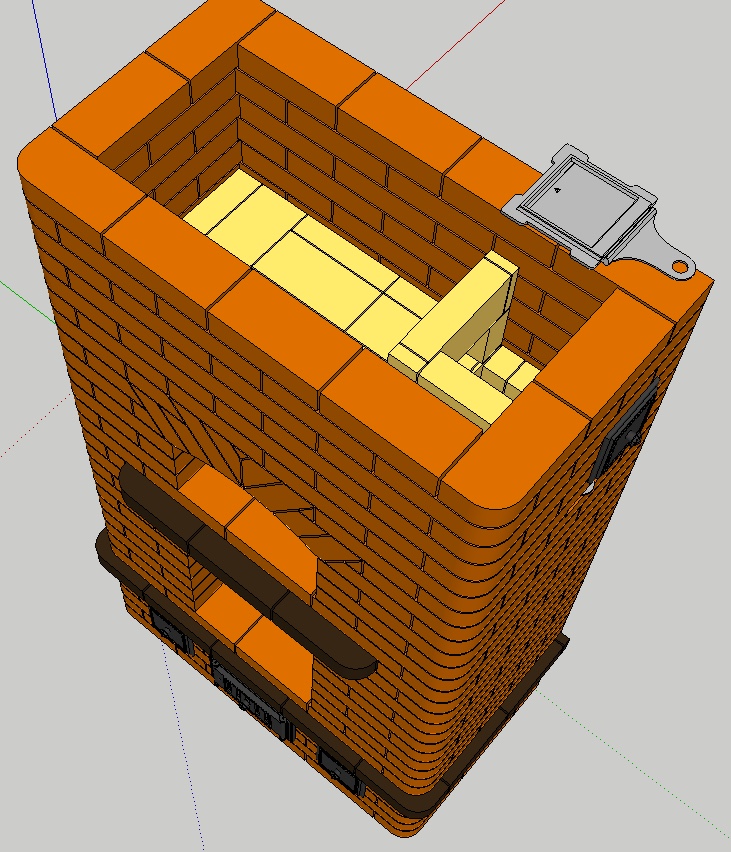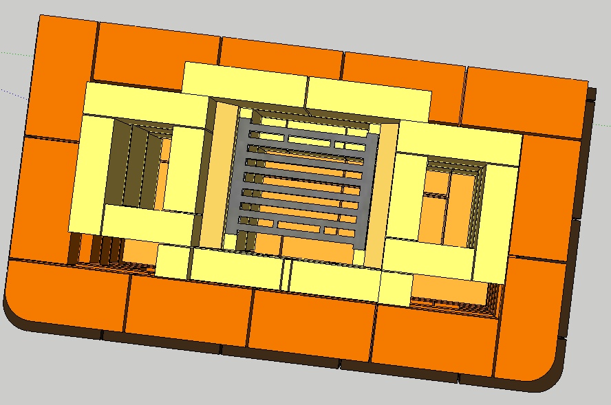 2. В проекте проведена футеровка только нисходящих каналов, восходящие представляют собой пространство между стенкой нисходящего канала и внешней стеной из керамического кирпича, такое решение привлекает быстрым прогревом печи, но не понятно как скажется на целостности всего строения в ходе эксплуатации, кроме того сечение нисходящих каналов несколько шире восходящих, допустимо ли это?