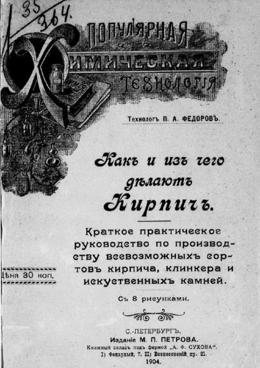 Крат. практ. руководство по пр-ву всевозмож. сортов кирпича, клинкера и искусств.[!] камней / Технол. П.А. Федоров. - Санкт-Петербург : изд. М.П. Петров, кн-во п/ф. "А.Ф. Сухова", 1904. - 30 с., 8 ил.; 24. - (Популярная химическая технология).