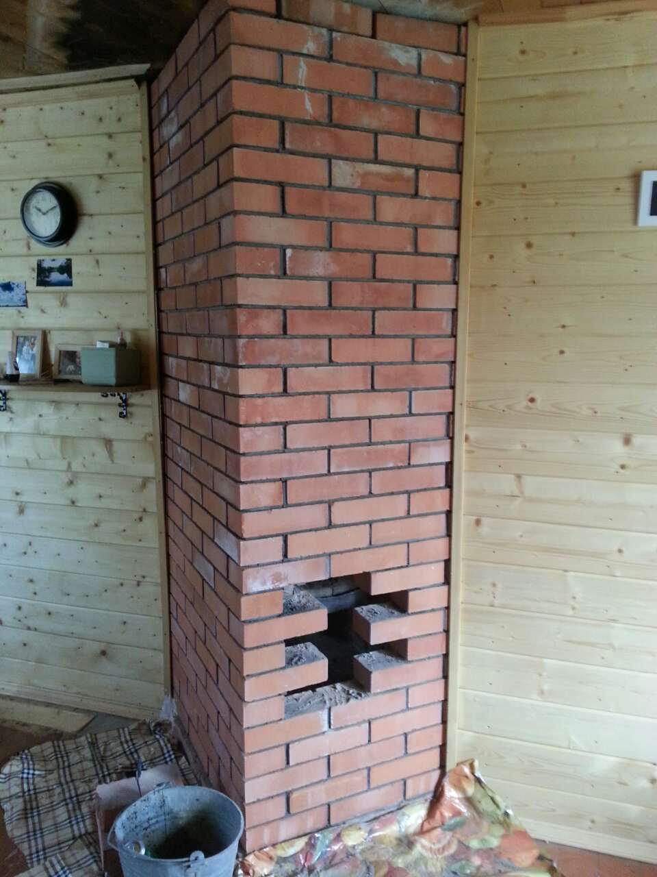 Сначала одну сторону печи и выложить в соответствии правилам печной кладки, соблюдая технику безопасности: не трогая несущие углы печи.