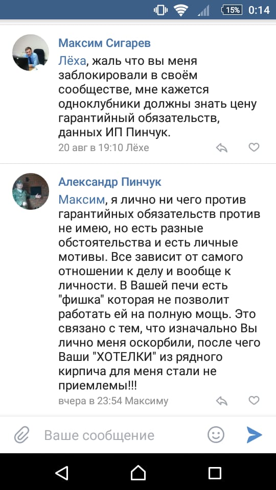 На просьбу приехать посмотреть, исполнить гарантийные обязательства (гарантийный талон имеется) Пинчук А.С. с 17.07 "кормит завтраками", а 17.08 перестал отвечать на звонки, так же игнорирует сообщения по электронной почте, в социальной сети и вацапе. Более того, удалось дозвониться до Пинчука с незнакомого ему номера, когда Пинчук А.С. понял кто ему звонит сказал "плохо слышно, что-то со связью" и повесил трубку. Вот такая цена гарантийных обязательств, которые даёт Пинчук А.С.