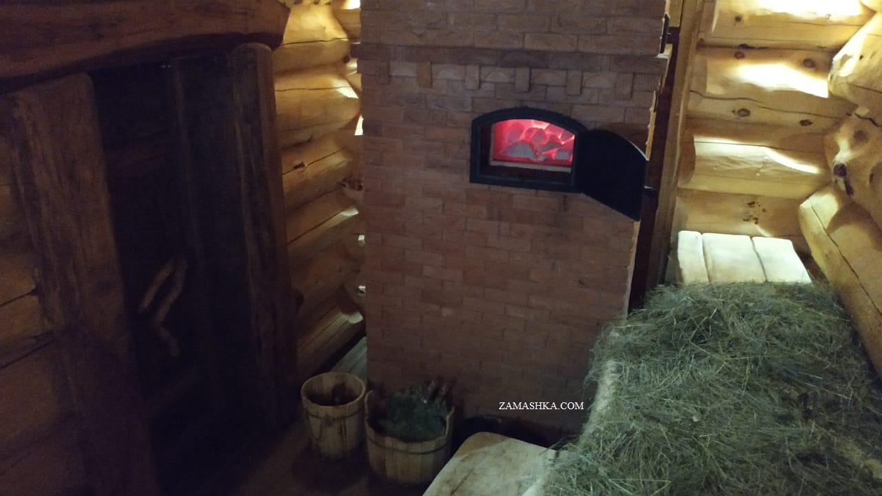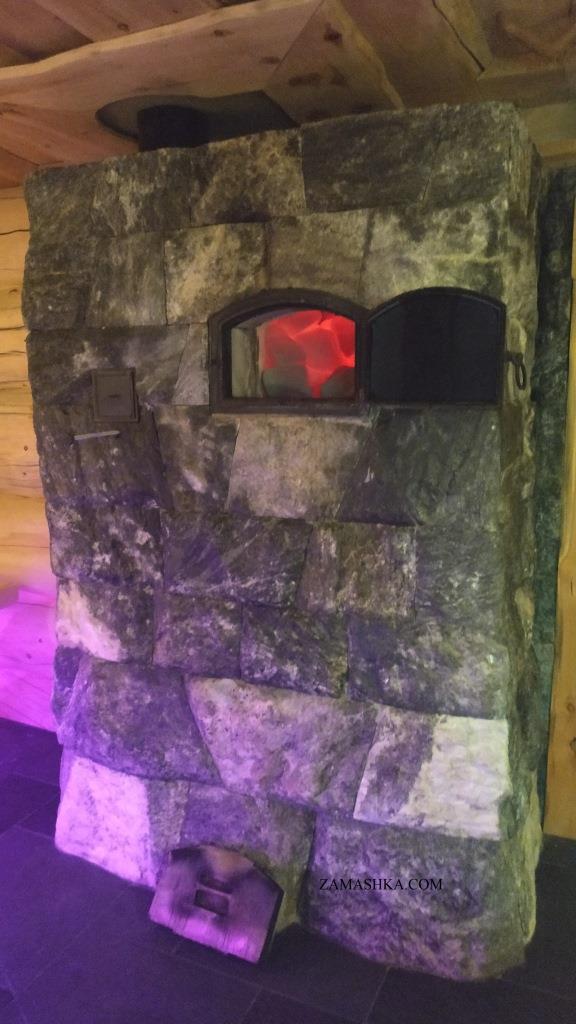 Меня интересует другое. Замашка сконструировал уникальную печь. Не знаю, как он это сделал, но при сжигание одной закладки в топке печи дерево на потолке (в районе трубы при рассмотренной выше разделки) и стены у вертикальной разделки печи имеют температуру в 100*С. Значит и камни уже нагрелись. С виду вроде печь стандартная - ядро и облицовка ... куда он столько топлива запихнул в одну закладку?