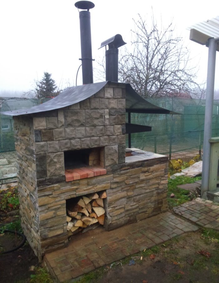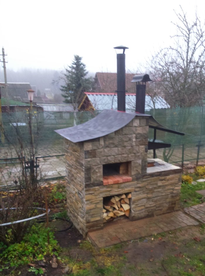 Стянул зад и перед печи по бокам 4 мя шпильками, просверлив переднюю стенку. Разжег, пока полет нормальный. Внутри готовил разные блюда - точно моя бабушка в детстве -- GIM - спасибо! Заканчиваю обкладывать свою печку кирпичем, сбоку попутно пристроил кирпичный мангал. Дымовой колпак над мангалом и выход из печи планирую связать с общей трубой гофрированными нержавеющими трубами по 60 см длинной через типовой тройник 45 град. Есть пара вопросов -