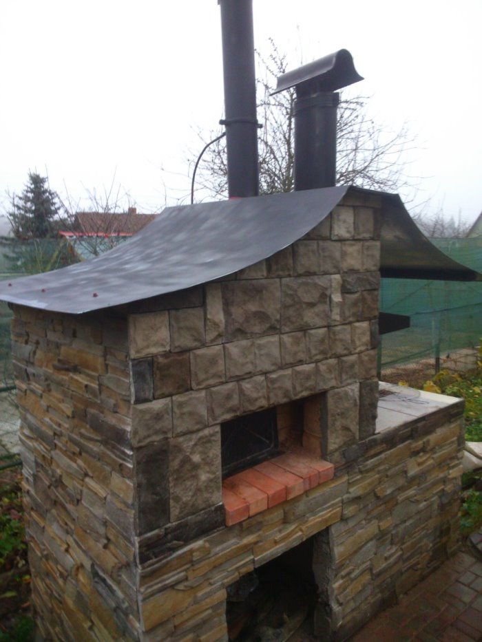 От гофры отказался. Простейшие опыты с временной трубой, согнутой из куска жести показали - часть дыма выходит прямо в лицо из печи , минуя трубу. Пришлось строить дымоход. Т. к. труба справа, верх дымохода ( уст. опытным путем ) слева направо по касательной идет с низу вверх до трубы. Дым, не имея тогда препятствий, весь уносится в трубу. Далее, взял отдельную трубу для мангала, не стал связывать ее с печной. Стоимость не велика + печная будет работать лучше. Получится ,что то типа парохода с 2 мя трубами.