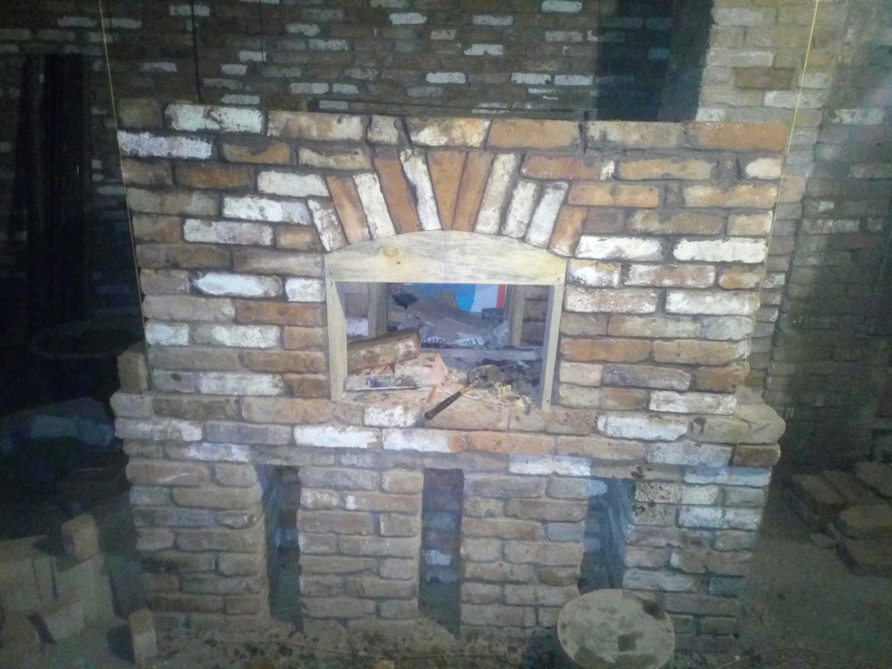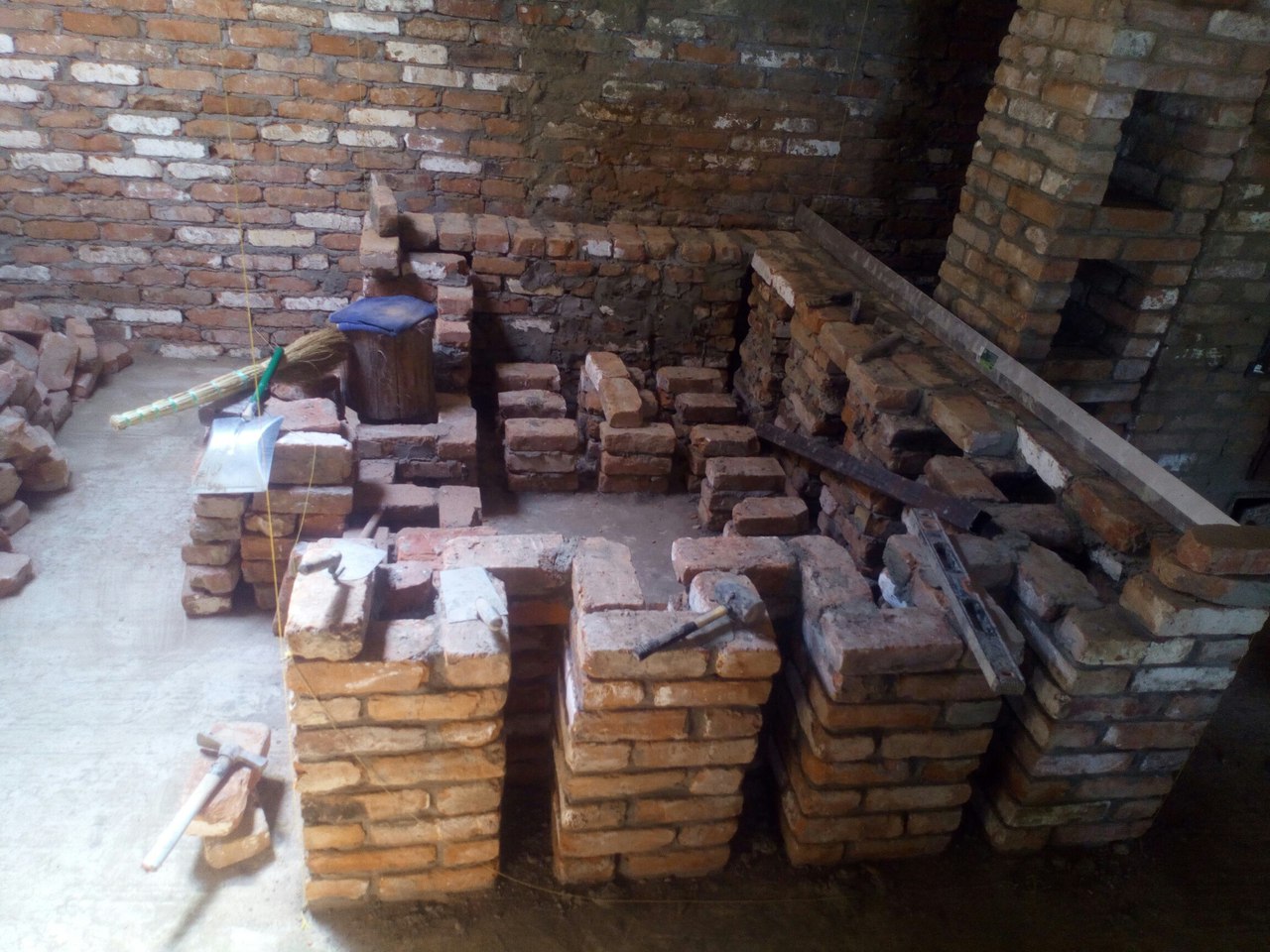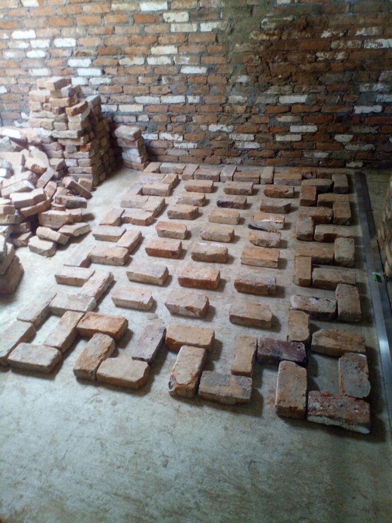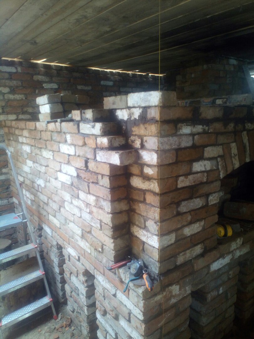 С кирпичом "повезло" особенно - он был добыт с развалов фермы советских времен - старый, б/у, кривой, косой, перепады по длине, толщине и ширине бывали до 2см и энтузиазма сначала этот кирпич не вызвал особого. К тому же часть кирпича была в цементном растворе, часть в глиняном, т.к. до меня была попытка сложить русскую печь, но она провалилась и печь была разобрана.