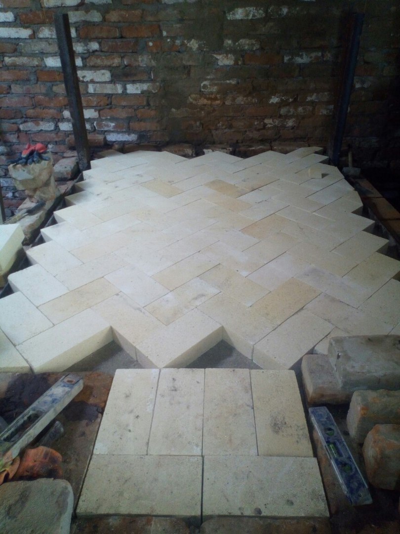 Металла под подом нет. Пару рядов под подом сделал из этого же кирпича, а за ряд до пода - положил более ровного Бжедуховского кирпича, сверху присыпал около 1см песка, разровнял его правилом и выстелил поверх него шамотом по типу брусчатки или тротуарной плитки, чтобы при перемещении форм для хлеба они не задевали поперечные линии кирпича.