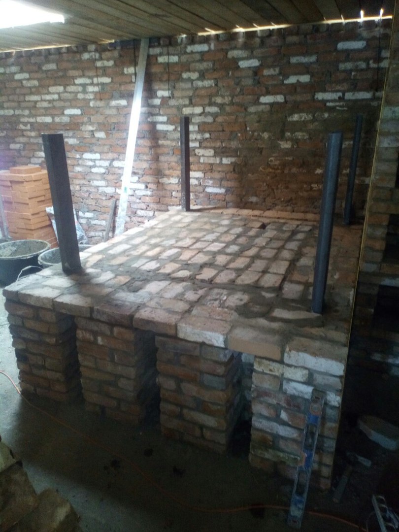Решили не засыпать основание (как советовал хозяин той хлебопечи) щебнем, битым стеклом, песком и т.п., а выбрали вариант на шанцах или колоннах из кирпича. Посчитали что кирпичи пода будут лучше лежать на надежном основании, чем на куче мусора и битого стекла.