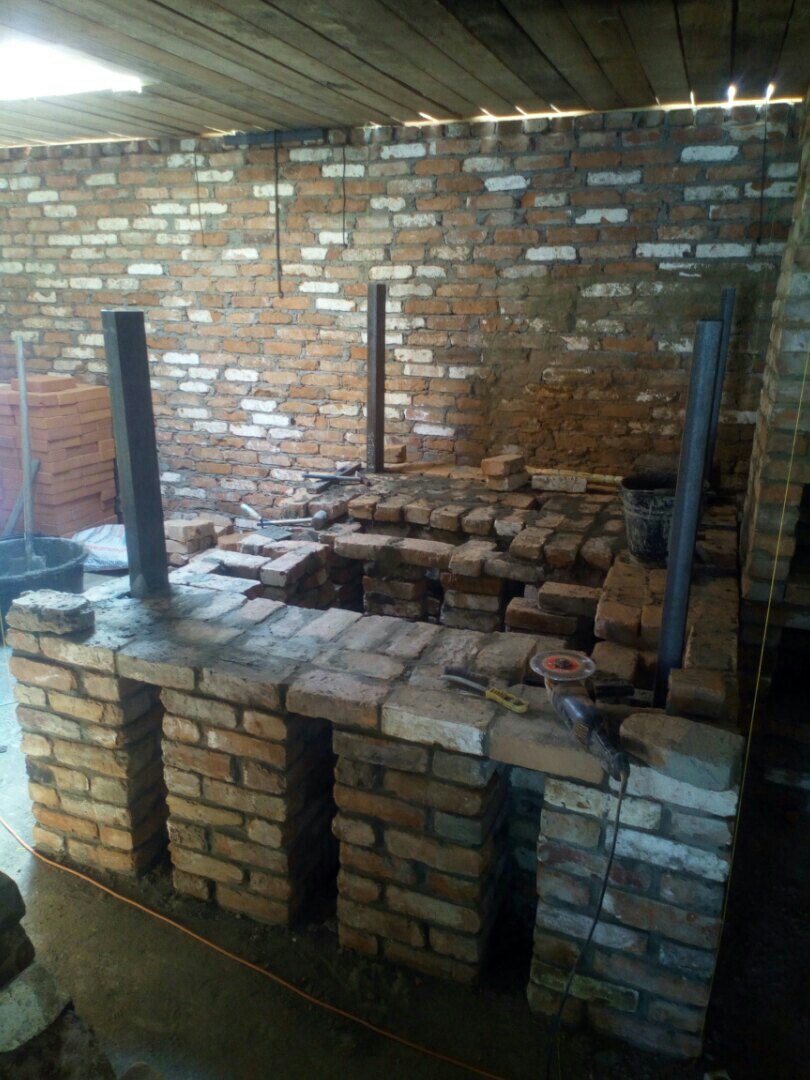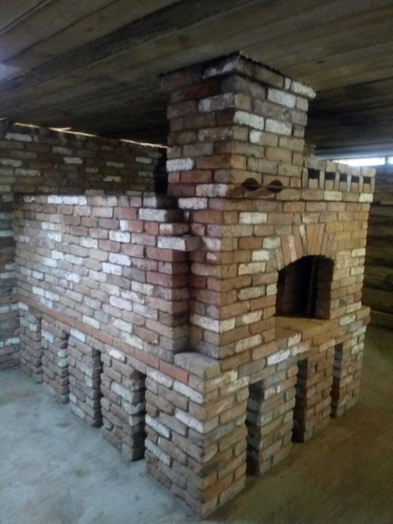 Для чистки кирпича, просеивания песка и глины мне были выделены помощники (спасибо Егору, Артему и Вячеславу). По ходу работы я привык к этому кирпичу, за три ряда до пода клал кирпичи на цементный раствор, потом перешел на глиняный.
