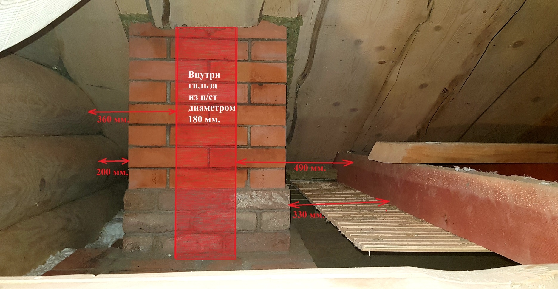 3. Расстояние от трубы и верха печи до балки перекрытия (второе фото)