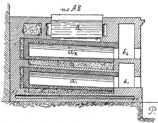 Данные о ней следующие: Она имеет в длину 4 3/4 арш. а в ширину 31/2 арш., высота — 3 арш. Топочные отверстия имеют в ширину 1 1/2 арш., а в высоту 6 1/2 верш. Под нижней пекарной камеры приподнят всего на 8 верш, оъ земли, вследствие чего, не смотря на сделанное перед ним в полу углубление (приямок) Р обслуживание его неудобно. Шестки b1 и b2, топочные отверстия и устья пекарных камер перекрыты плоскими покрытиями по железным листамъ (у шестков) или полосам (у отверстий).