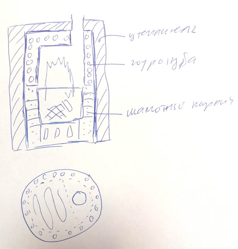Одна непонятная вещь - как организовать выпуск дыма. Если просто напрямую, мне кажется уйдет много тепла в трубу. Надо ее как-то забрать. Делать какие-то выступы,чтобы он змейкой шел. Типа плоский выступ с одной стороны, потом с другой.