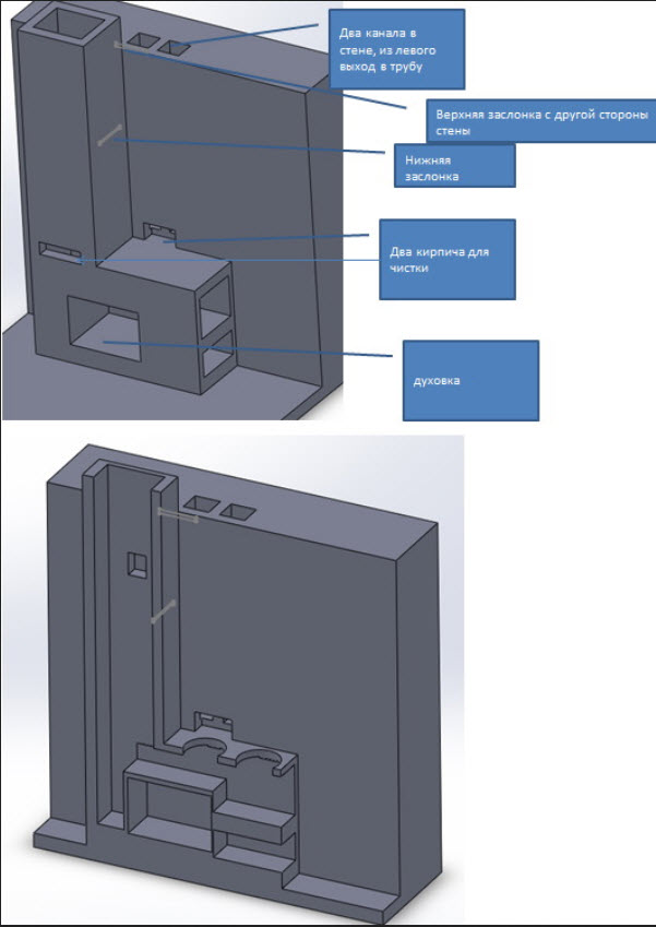 Правильно, вот на рисунке эти два канала в щите и указаны. На их уровне стена греется весьма слабо. Да, и верхняя заслонка не показана, она находится с другой стороны стены. А сама духовка не может иметь никаких выходов в эти каналы, между ее концом и противоположной стороной стены сантиметров 15-20. Буду на даче, померяю точно.