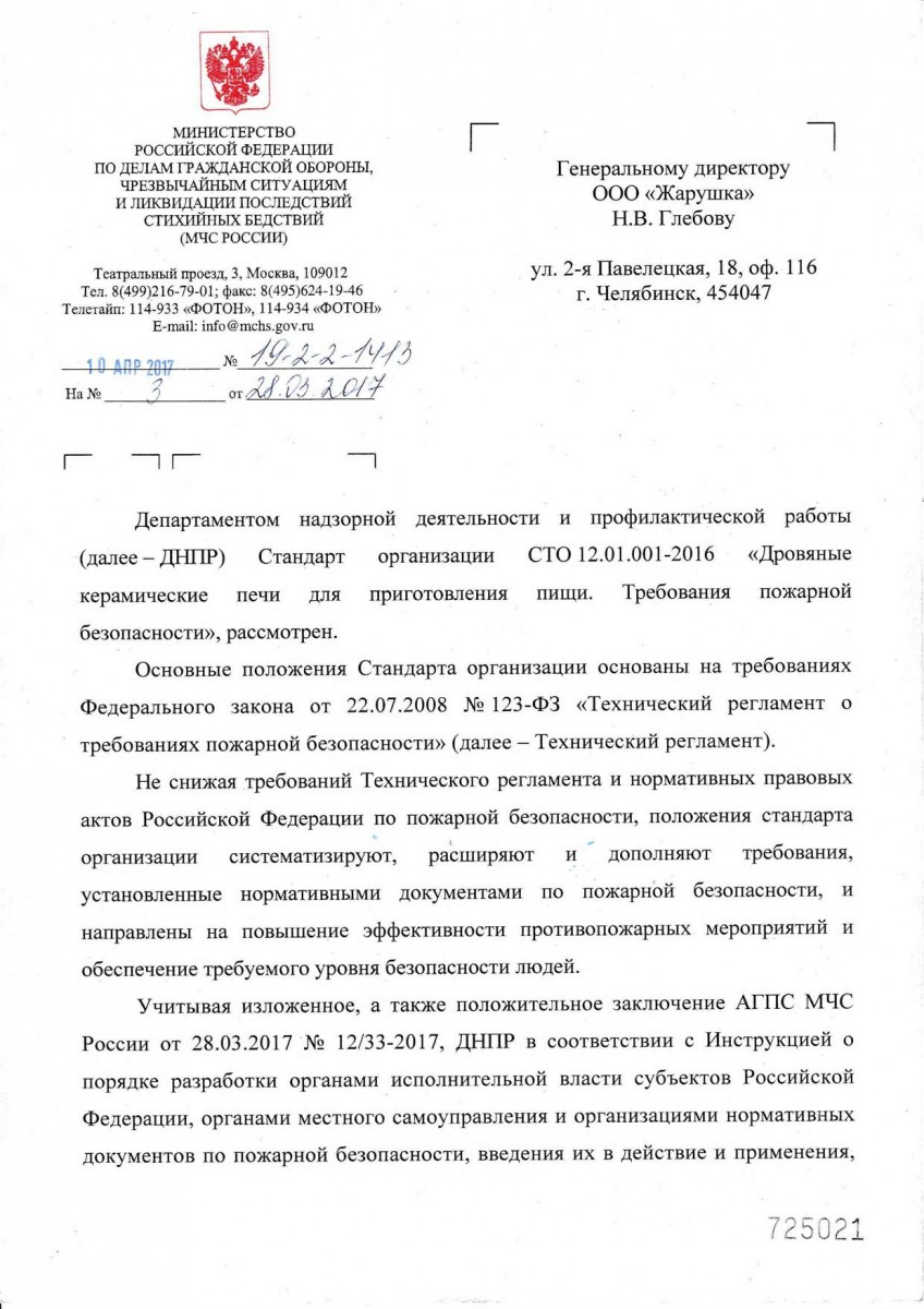 Компания "Жарушка" прошла экспертизу в Академии МЧС России, и согласование в ДНД МЧС России, теперь установка дровяных печей "Жарушка" не требует оформления СТУ на объект установки!