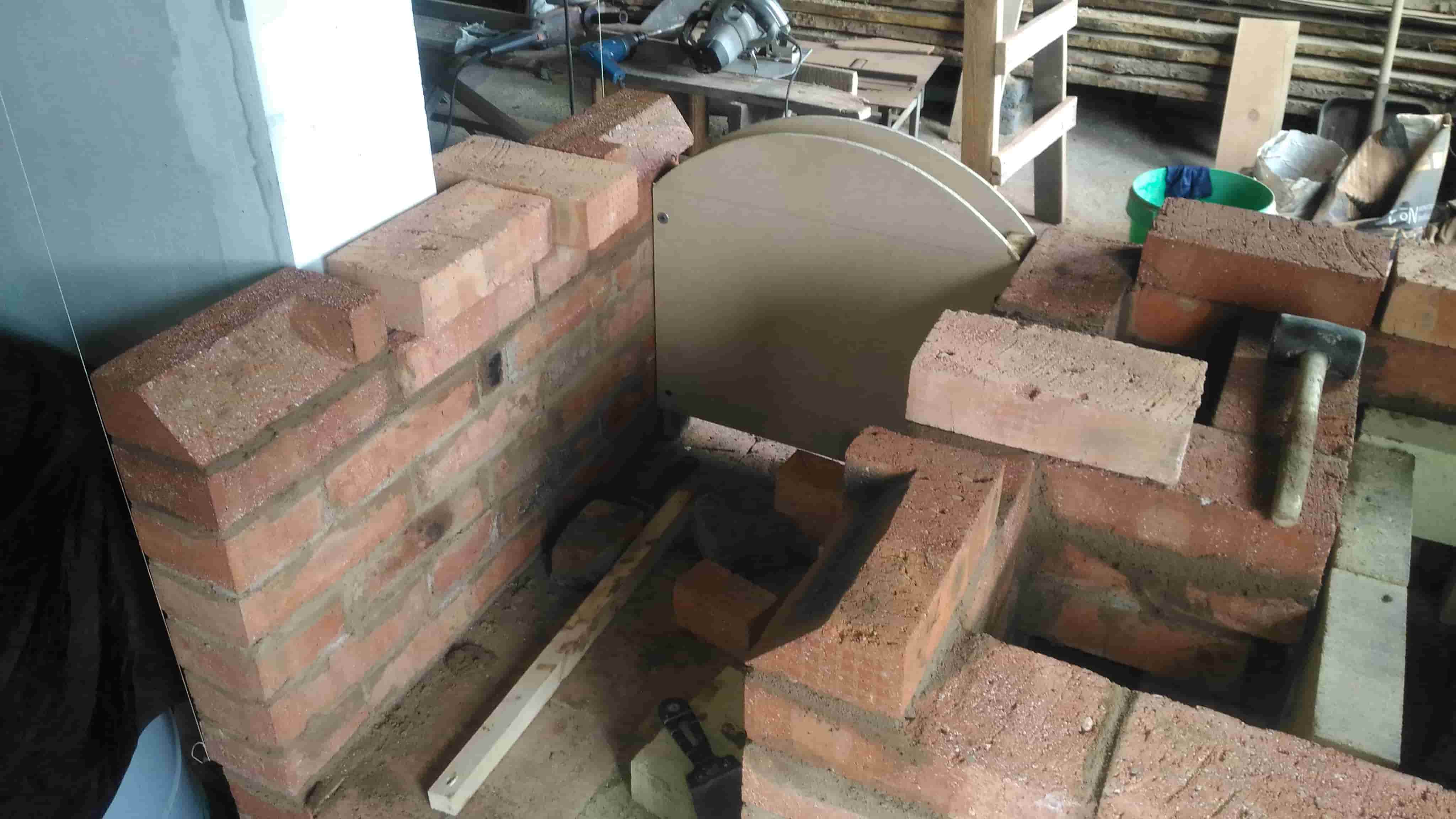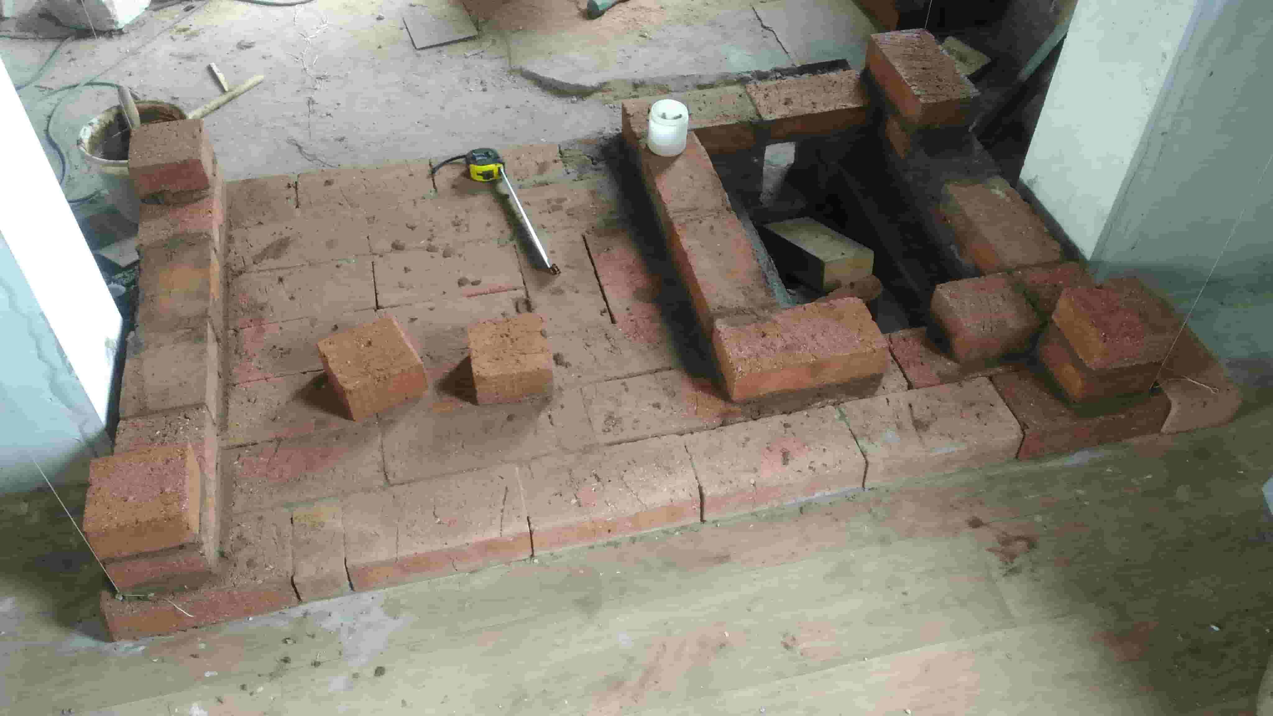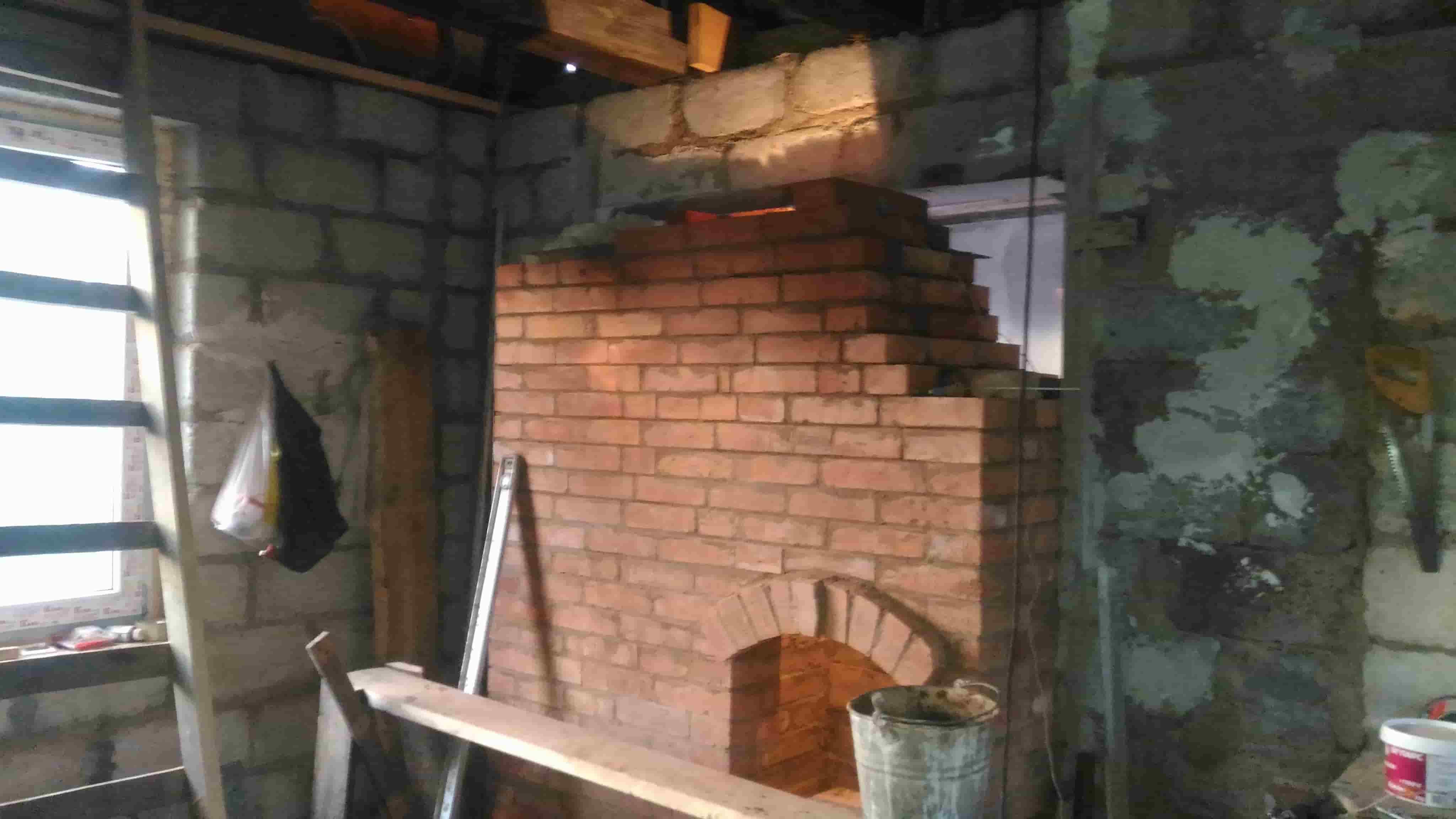 На фотографиях видно, что одно крыло будет опираться на кладку толщиной в 0.5 кирпича, нда... маловато. Посчитав нагрузку на арки портала камина и прикинув величину распорного усилия продолжаем работу дальше безо всяких усилений.