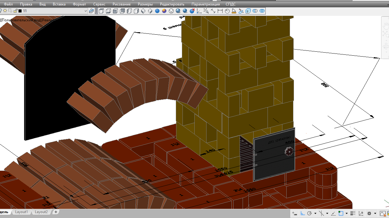 По первым намёткам очаг получается слишком глубоким, хорошо, делим очаг пополам кирпичом на ребро с возможностью топить камин либо из одного помещения, либо из другого. Получается глубина очага 405 мм с каждой стороны, как правило меньше 2х кирпичей в глубину никогда не делал. Но 405 мм это и не минимум.