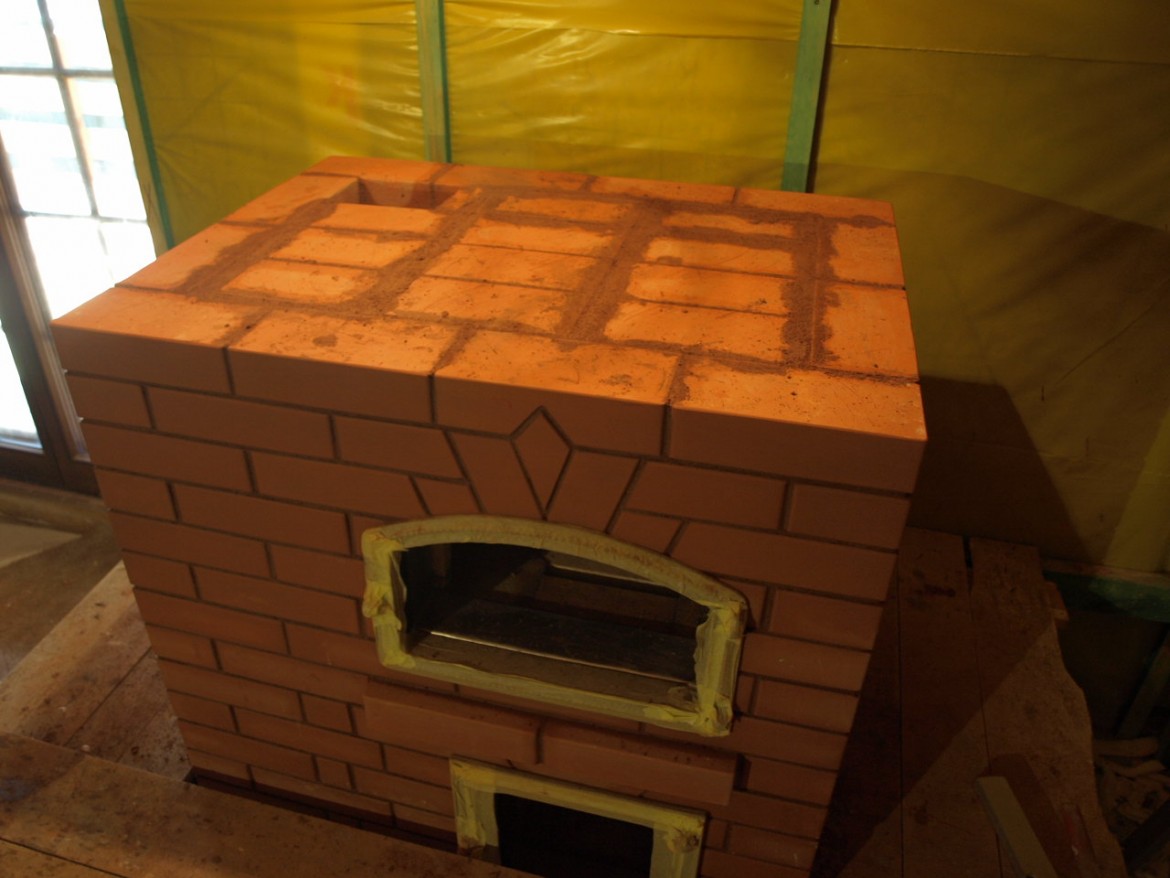 | Несимметричная. Шамотная плитка и печная штукатурка. |