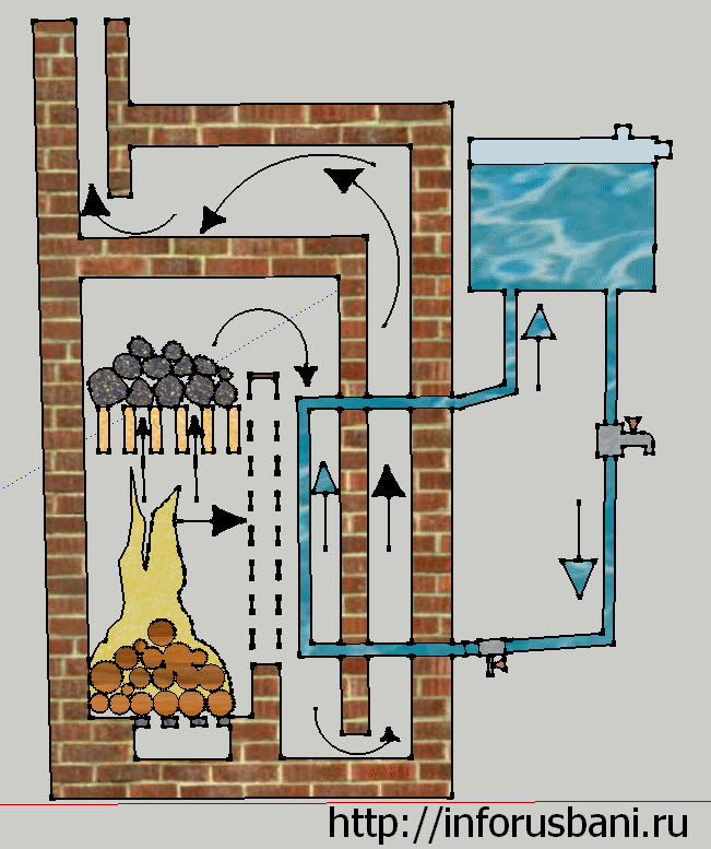Именно в нижнем колпаке кирпичной банной печи за стенкой топливника и размещают регистр ГВС.