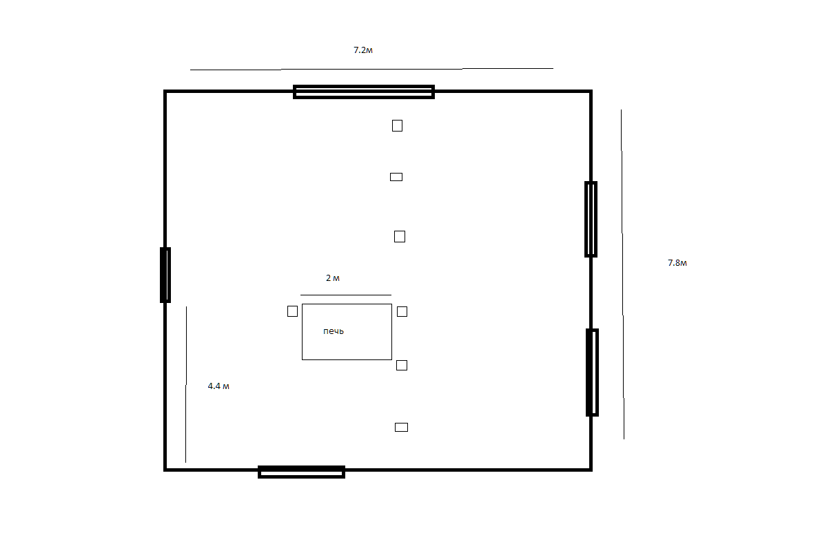 Дом сруб, высота 2.6 .Ширина 7.2 на 7.8..В доме стяжка. Фундамент под печь 1,9 на 1,9 остался от старой печи..балки потолка со временем провисли от опилок (почти 8 метров без опоры это слишком)поэтому посередине поставил опоры