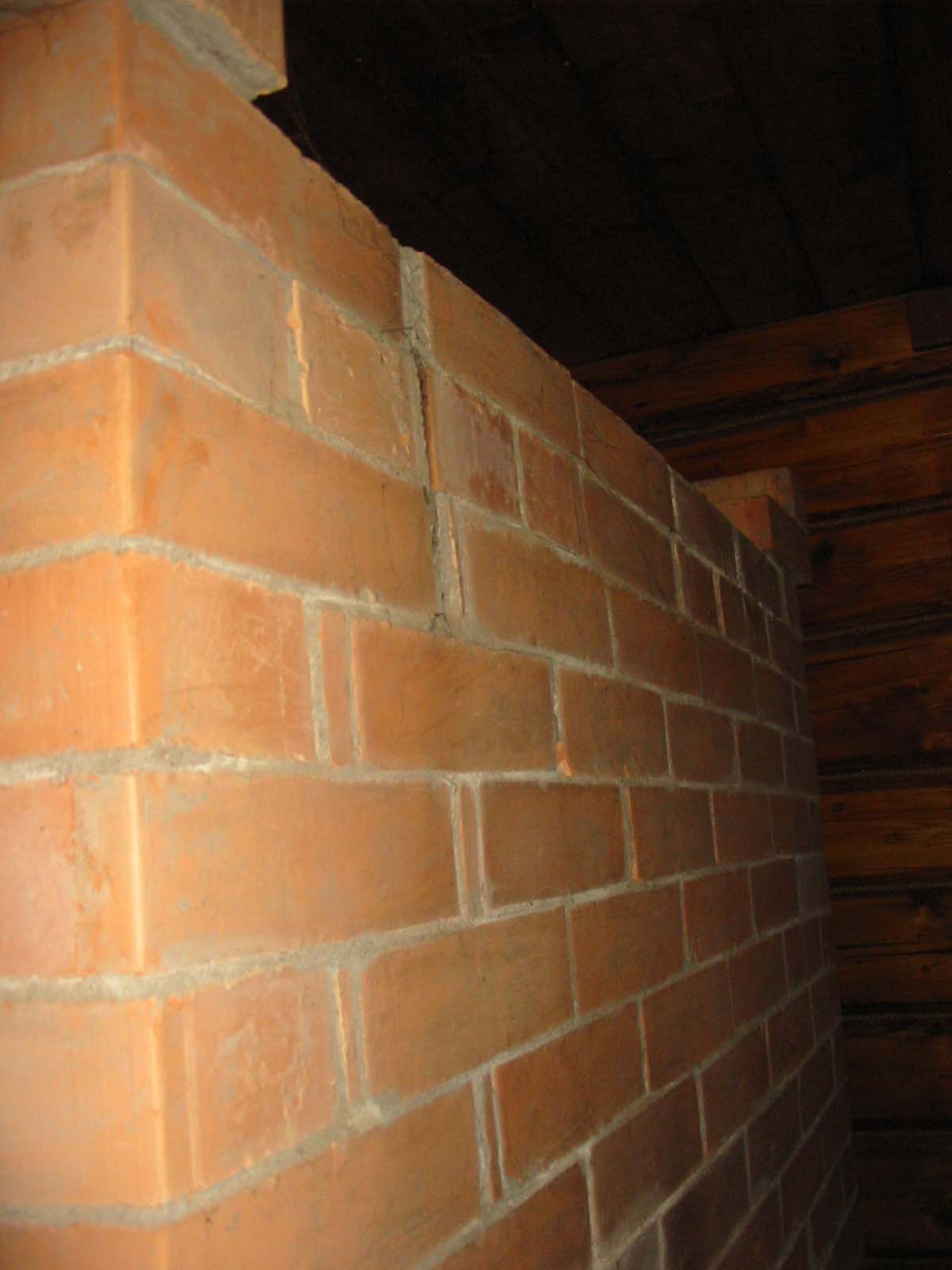 | Вид свода топки. Куски кирпича откололись уже давно. А вот шов раскрылся похоже только после потопа. Такое впечатление, что кирпичи просели |