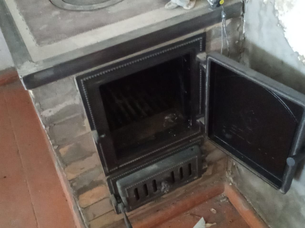 Проблема: печь дымит при открытии дверцы. Появилась проблема после ее перекладки. Печник немного опустил низ топки и поменял способ закладки (закладывались дрова сверху после съема колец, он сделал дверцу) и разобрал внутри перегородку, по-моему сделал немного выше на 1-2 кирпича.