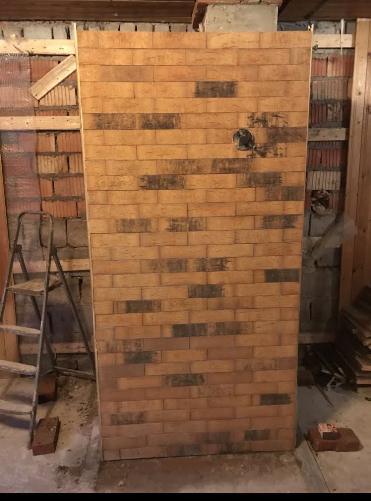 Мастер согласился переделать, результат ужасающий, кладка кривая/ косая, ну ладно это дальняя стена, но самое главное что после пяти топок плитка опять отходит.