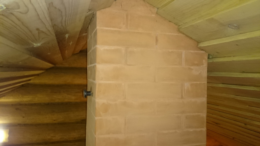 В бане второй свет, над парилкой и помывочной есть антресоль, поэтому труба печи проходит почти вся в помещении и выходит на сразу крышу. Сложена в 6 кирпичей, имеет две независимые задвижки, для печи-каменки и основной печке.