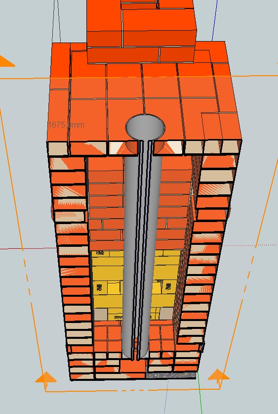 Выход в трубу уменьшен до четверика, ибо далее (по 2-у этажу и на чердак) пойдет нержавейка 140 мм, обложеная газоблоком 100*200*600 пополам (такой себе четверик 400*400 наружных, 200*200 внутренних) с прокладкой из базальтовой ваты