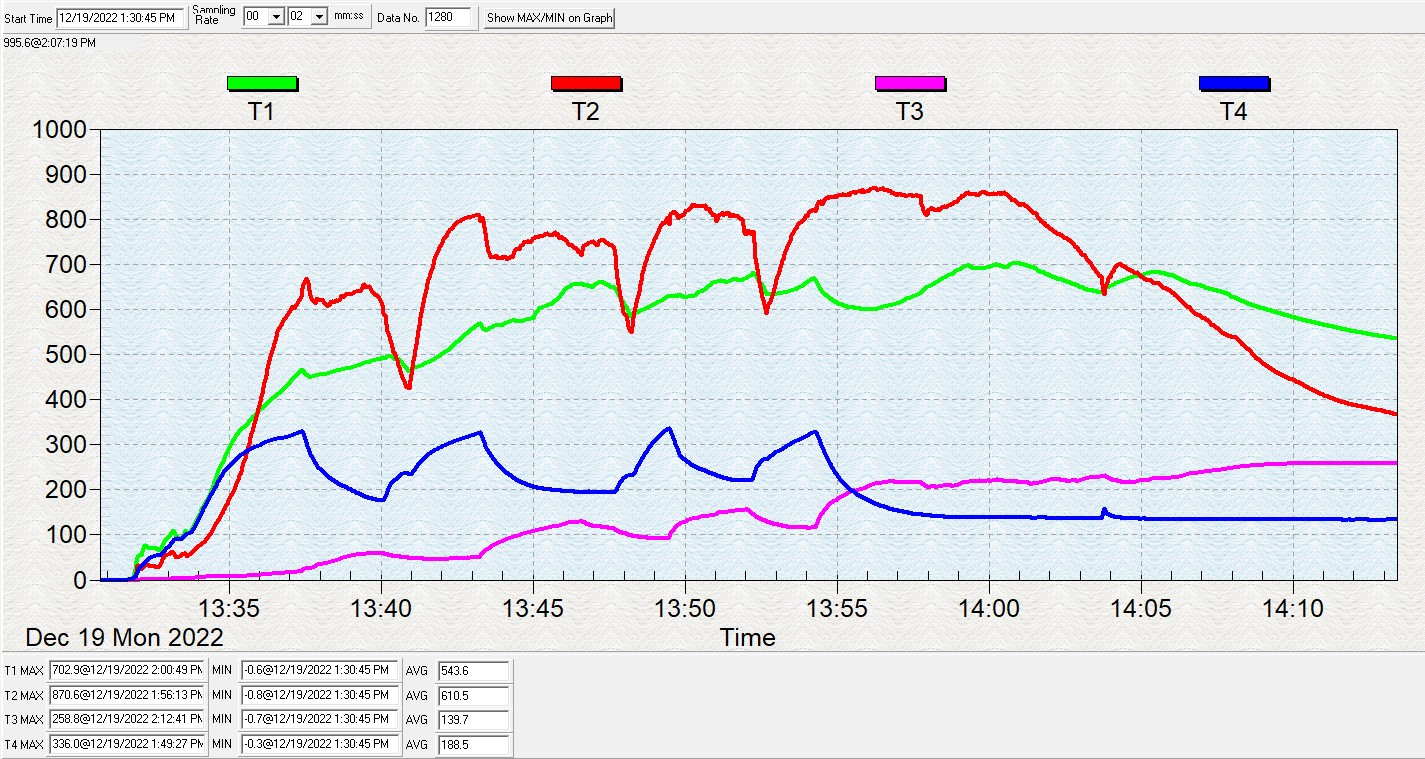 Как мне кажется, из обсуждения выпал еще один класс топок, где присутствуют элементы как подовой, так и колосниковой. Например, моя печка имеет в аккурат такое строение: колосник подо всей площадью топки, частично заложенный шамотом. Как это выглядит на графиках, предлагаю посмотреть ниже - это запись 4-х термопар вчерашнего вытопа моей бани. |