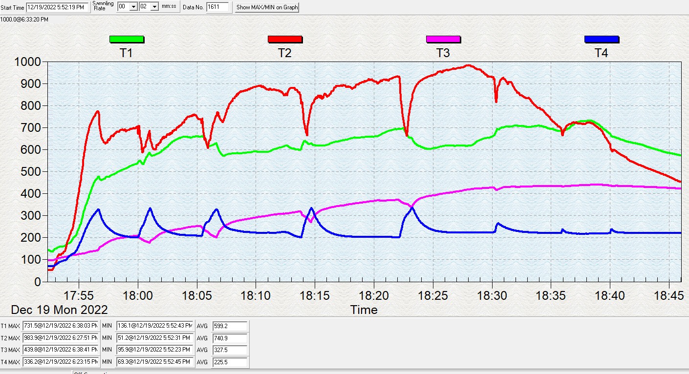 Странно. Глядя на первый график, сразу же подумалось про подкладку дров в закладку на зубцах. Ещё посмотрел, что как-то рановато, решил что топится малыми порциями.. Меня заинтриговало иное: температура до первой подкладки дров в реакторе всего 600*С .. маловато как-то.