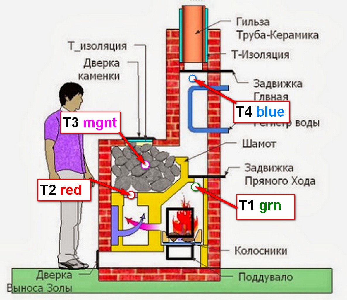 Т1 - топка 4\5 по высоте, цвет зеленый. Т2 - выход из Реактора, цвет красный. Т3 - каменка 2\3 по высоте, цвет магента. Т4 - труба ниже задвижки, цвет голубой. |