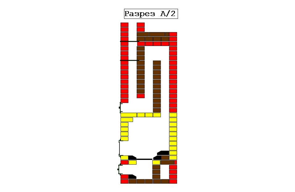 Кстати, нашёл ещё один чертёж печи ПТО-2500, на котором несколько другие размеры. Топка на один ряд кирпичей больше/выше и само перекрытие топки толще - в 1-ом варианте только один ряд шамотного кирпича, здесь же к нему добавляется обычный. Это, как мне кажется лучше, ведь здесь сосредоточен весь жар. Переход из первого во второй канал в этом варианте уже на 1 кирпич. Не знаю, критично ли это. В остальном, всё так-же.