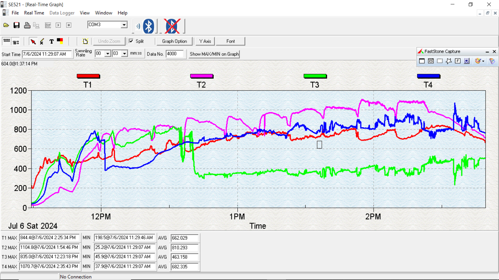 3. При первичной растопке (при холодной топке, открытом поддувале ПВ, открытой задвижке прямого хода на трубе ПХ, закрытой ВВ в камере дожига, холодной камере дожига и холодных камнях - барьере для дыма, фактически глухой перекрыше камеры дожига) дымовые газы в хайле Т1 быстро набирают температуру (особенно, при использовании щепы-хвороста вместо дров-поленьев), что вполне естественно.