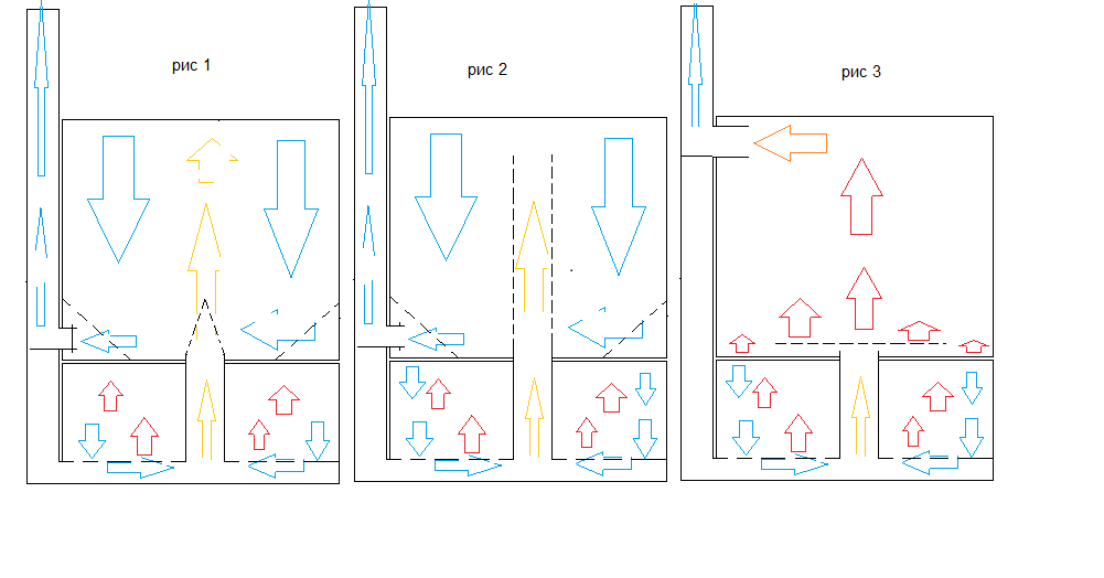Я склоняюсь ко второму варианту. В первом варианте никакого равномерного прогрева древесных чурок не будет Дымогазы сразу пойдут в трубу. В третьем варианте верхний правый угол не будет задействован.