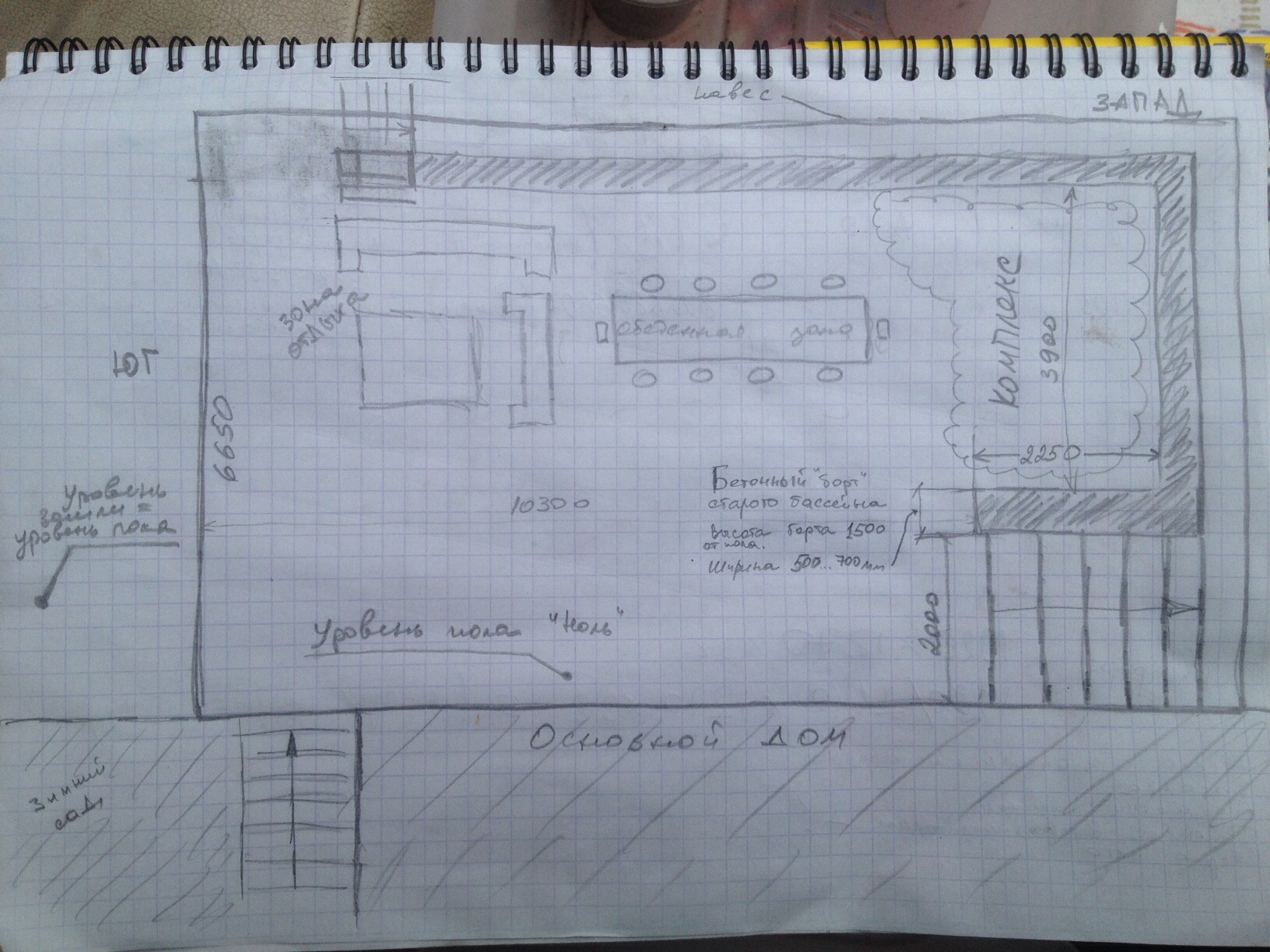 Печь будет в бывшем бассейне. Бассейн строил дед в 60-х. Внутренний размер 10х4 метра. Стены пол-метровые сделаны из арматуры, какого-то белого камня, похожего на мел, и раствора, выровнены силикатным кирпичом в четверть кирпича. Пол разобрал до песка. Одна короткая стена и длинная стена на 3/4 удалены. В получившемся закутке хочу построить печной комплекс.