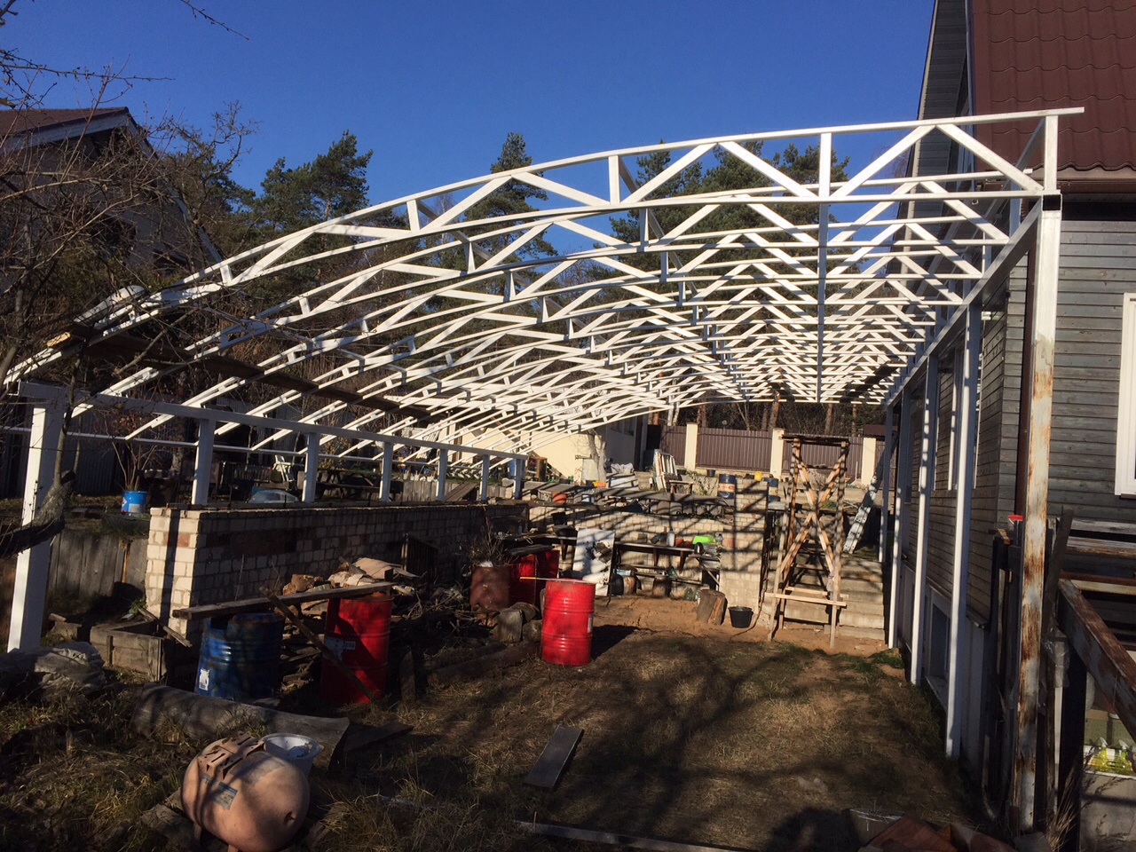 Вся конструкция накрыта навесом из поликарбоната ~12х8 метров, в высоту от 2 до 4 метров; таким образом должна получиться зона отдыха как-бы на улице, но при этом защищенная от осадков и с возможностью комфортного пребывания до поздней осени.