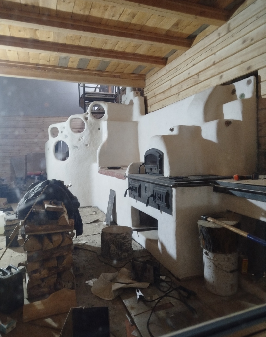 Топливник находится под лестницей. Покажу потом, как лестница будет готова, вторая часть. Вторая часть лестницы в процессе и лежит процесс на мне. Закончу просушку, все испытания измерения, приеду домой и видео солью с показом наружности и частично с фрагментами внутренностей.