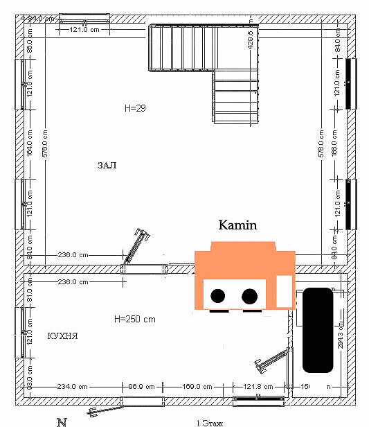 Итак я рекомендую организовать камино-печь в комнате и варочную печь в кухне, под лестницей можно разместить теплый туалет, что детям зимой в доме гораздо важнее ванной комнаты. На мой взгляд это наиболее рациональное и сбалансированное решение для периодического проживания зимой и постоянного летом.
