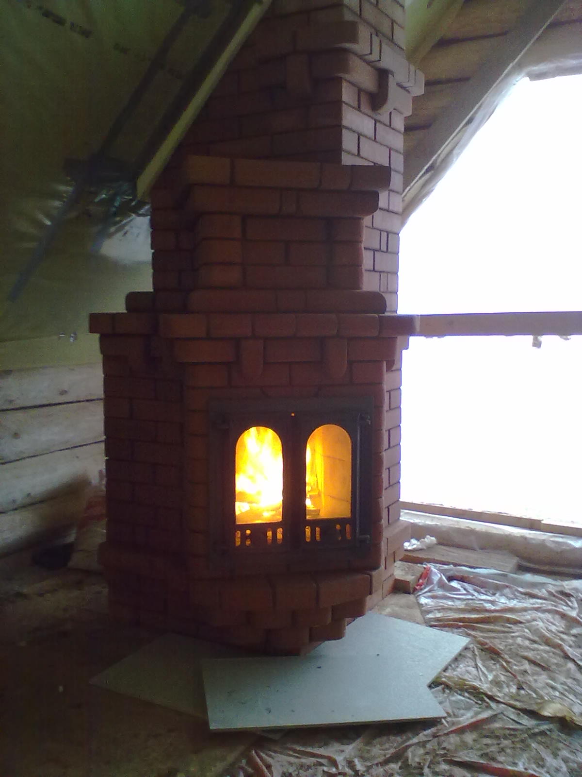 Небольшой угловой фундамент и размещение потолочных балок не дали выполнить камин по привычной схеме, поэтому на Ваш суд вот такой камин