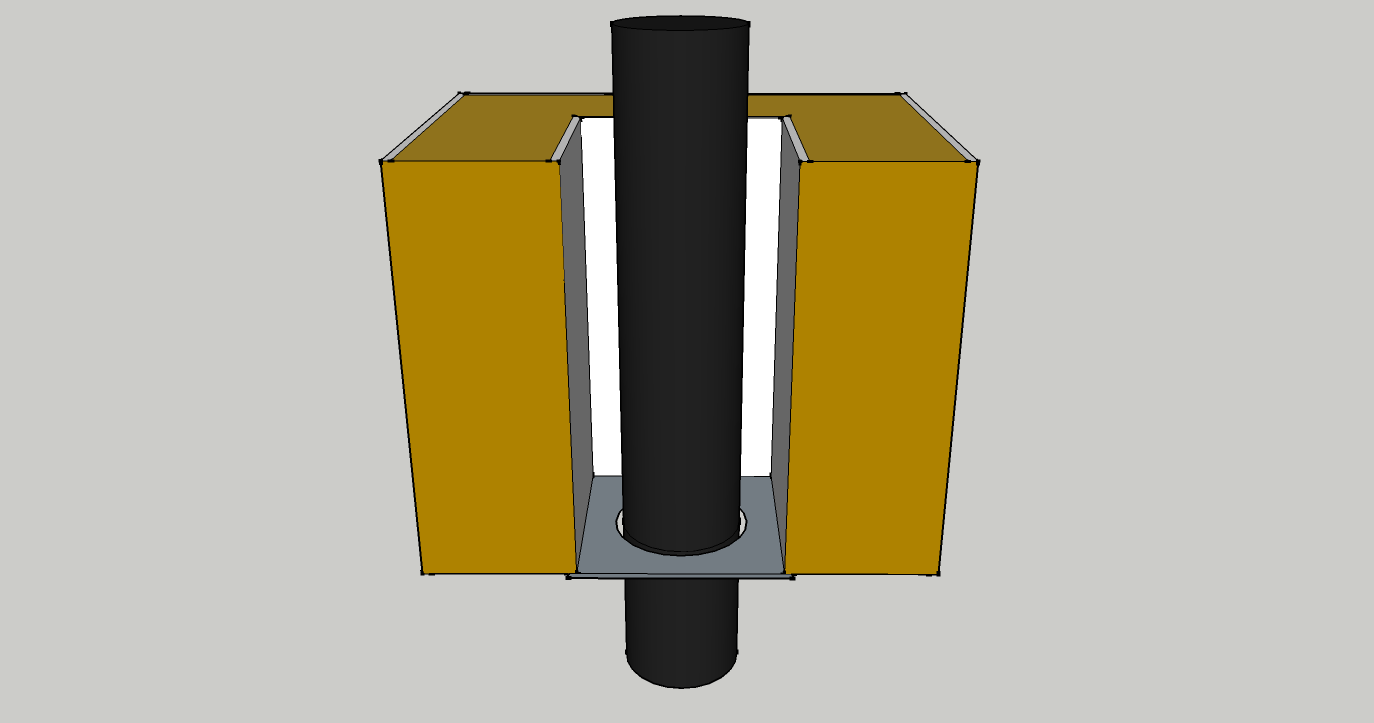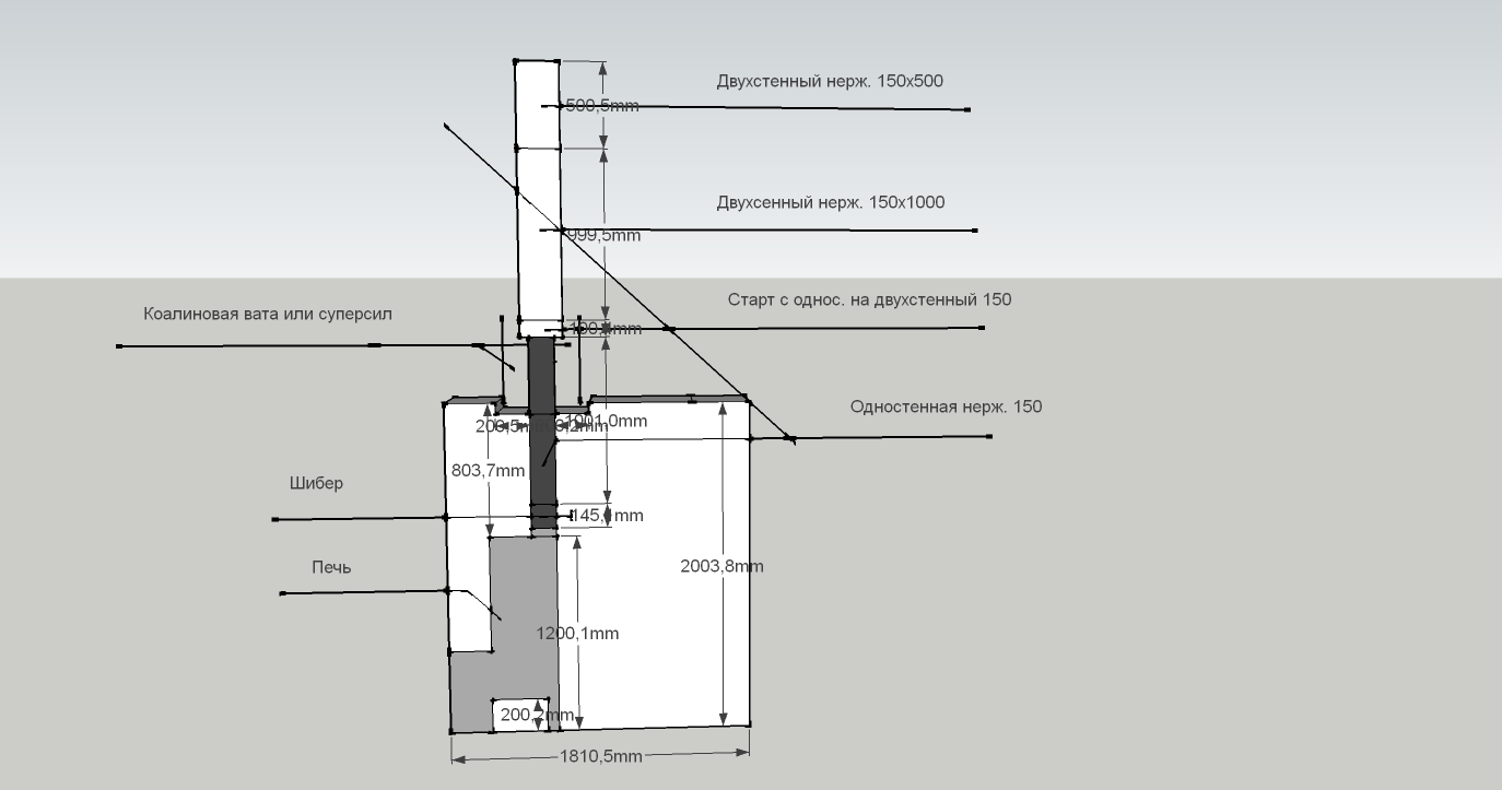 Собираю метал.банную печь. Высота потолка в парной 2 метра сборка по стандарту от печи переход на двустенный дымоход затем потолочный узел и.т.д. А хотелось вместо перехода на двустенную трубу поставить одно стенную трубу изготовит сетку и заложить камнем так и получим дополнительное тепло в парилке это не ноу-хау делают многие только есть у меня загвоздка и соображения по этому поводу. То есть ...... Собрать в таком порядке. Печь от неё шибер+одностенную нерж.+потолочный проход как вариант который предложил Евгений Колчин фото прилагаю в коробе сделать отступы от трубы по 200 мм до стенок короба и заполнить коалиновой ватой или суперсилом далее в под чердачном помещении установить старт на двустенную трубу и через кровлю на улицу. Идея воплотимая но сомнения по поводу потолочного прохода. Есть соображения..........
