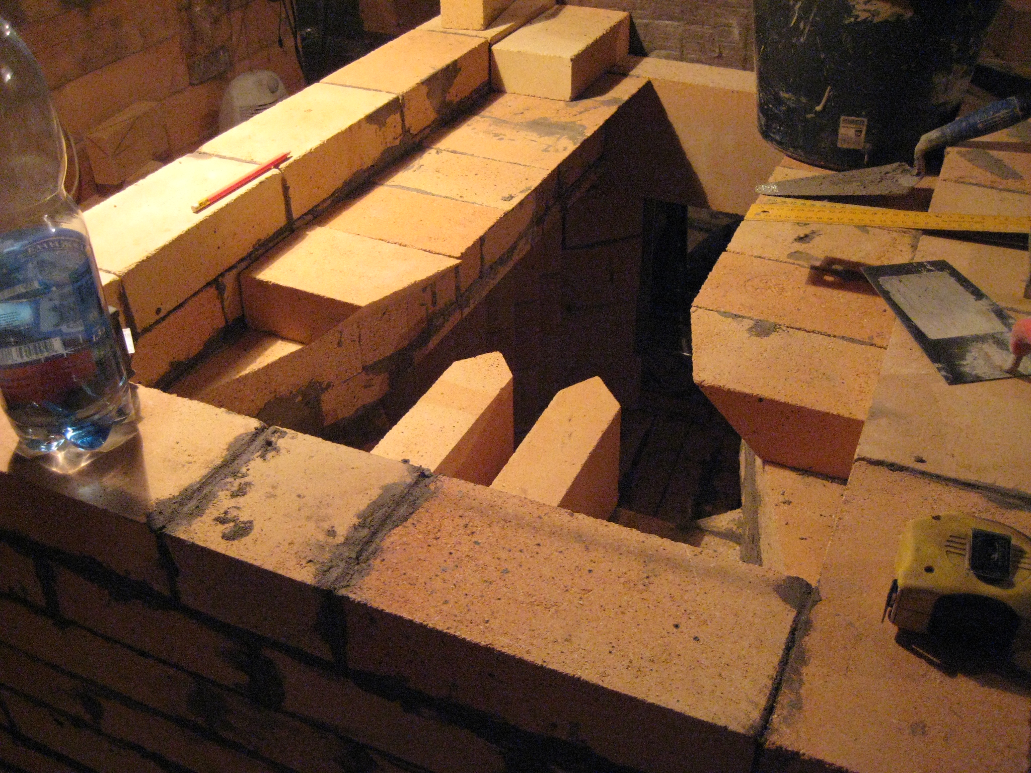 Сердечник собран на "Гарант+". За футеровку конечно страшно, но уж больно хотелось попробовать! Получилось что дрова к стенкам полностью не прилегают, лучше омываются воздухом, увеличена площадь тепловоспринимающей поверхности, подача вторички организована в углах и прогрев стенок не нарушается. Переход в опускной, жаровый канал является камерой дожига, в какой-то степени.