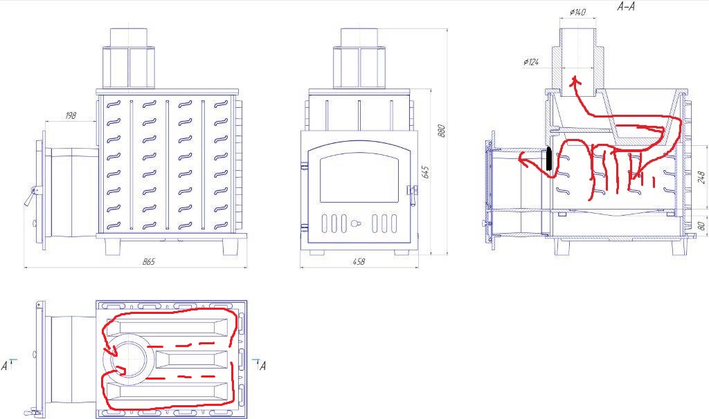да все как обычно нету 1)места для высоты сгорания 2) прямого хода таки нет ( дым в отбойник и вниз ныряет ) 3) подпор воздуха как у камина портал к сечению трубы дверка большая 4) угол под 90 тормозит в горизонте патрубка . Прогреваете трубу закладывайте сразу закладку лишний раз не открывайте это косяк у всех почти металюг с огромными дверками.
