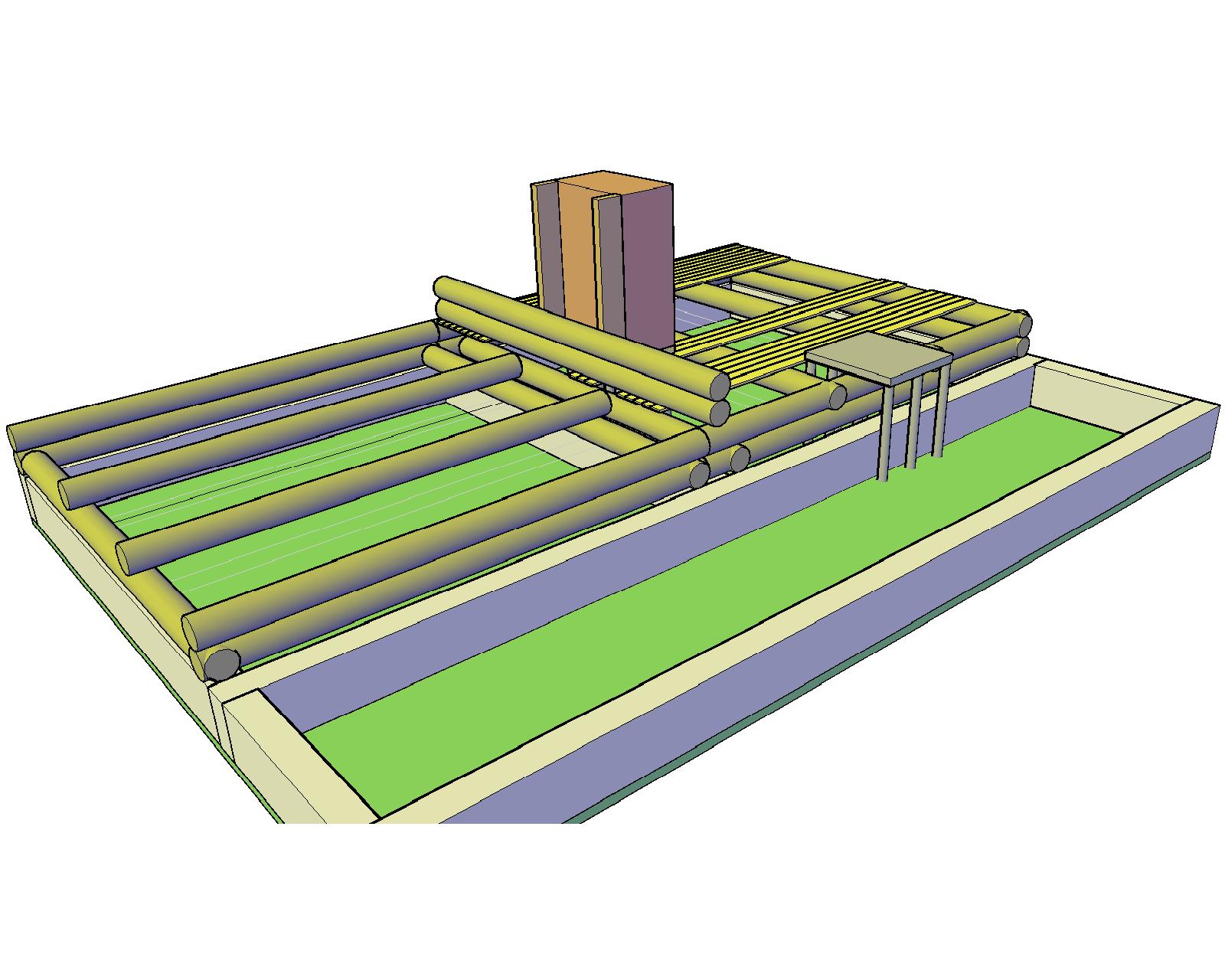 фундамент на 6-ти ногах Д100, выступающий в кухню-прихожую в обход бет. блоков
