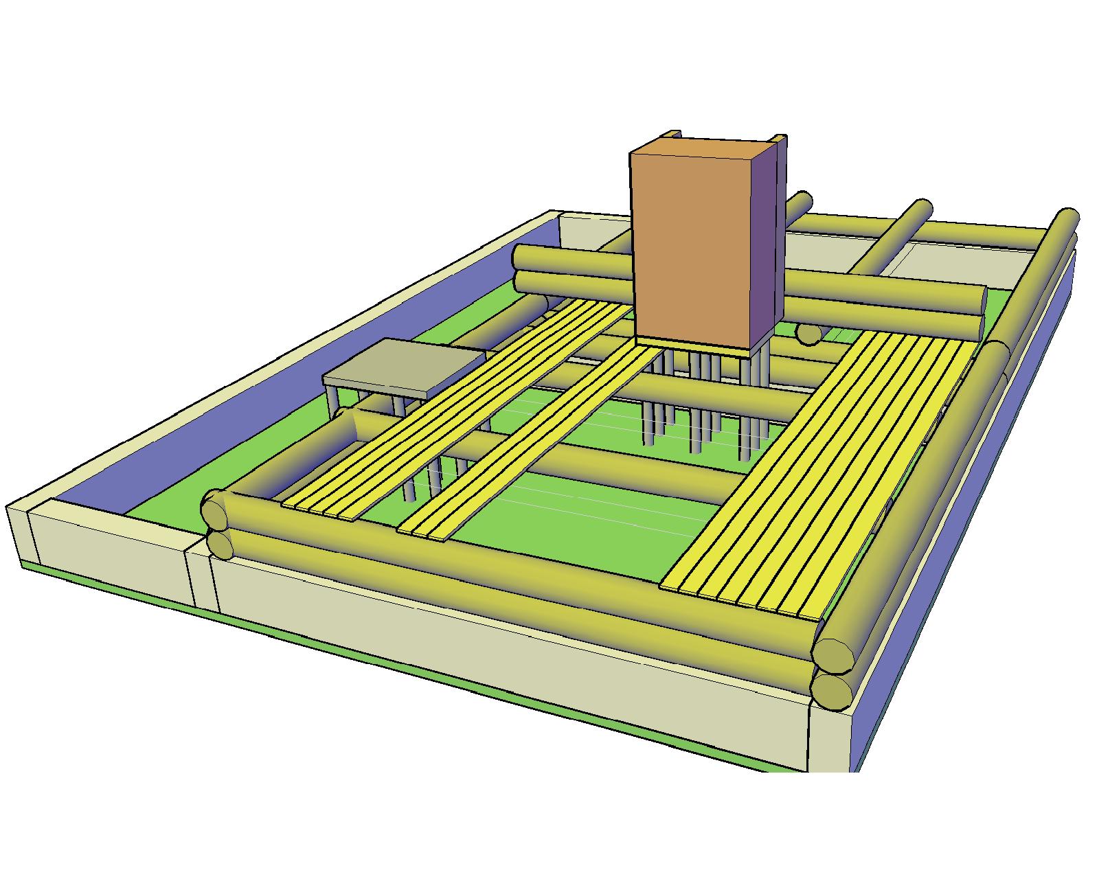 Один вариант (виден на плане и 1-м 3D эскизе) - обойти фундаментный блок, но тогда плита будет над полом (нижний венец трогать нельзя, насколько я понимаю, иначе дом развалится).