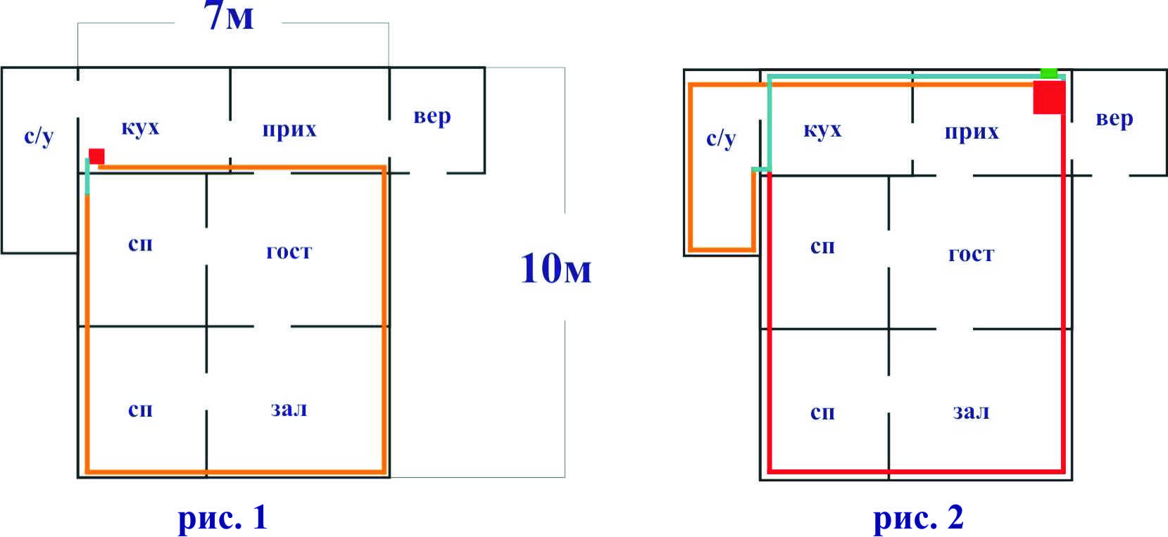 Хочется: Печь-котел Кузнецова разместить в прихожей(рис.2). Развести две ветки труб или батарей если это возможно. Большая по дому (красная) малая - кухня и сан. узел (оранжевая).