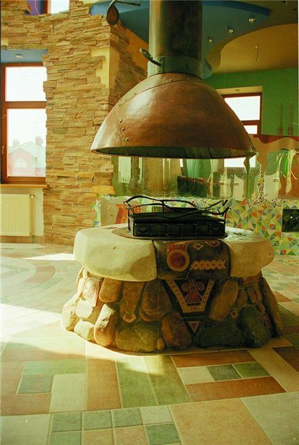 Прибором пользовались лет сто ,а на потолке нет и следа от тепловых ожогов,т.к. учень умеренная попка(без фанатизма) приводила к быстрому нагреву именно пола. В наш просвешенный век можно и должно подшить потолок V-образным (угол раскрыва 160-170гр)листом зеркальной нержи или меди поверх войлока с глиняной пропиткой.тем самым еще больше увеличив эффект ИК прогрева пола и кроватей . Вместо плиты можно установить кирпичный, закрытый красивой дверкой со стеклом,камин.Вследствии легкости печи Вы вольны установить ее где угодно (не требует фундамента) с соблюдением ППБ и пож.безопоасных расстояний.
