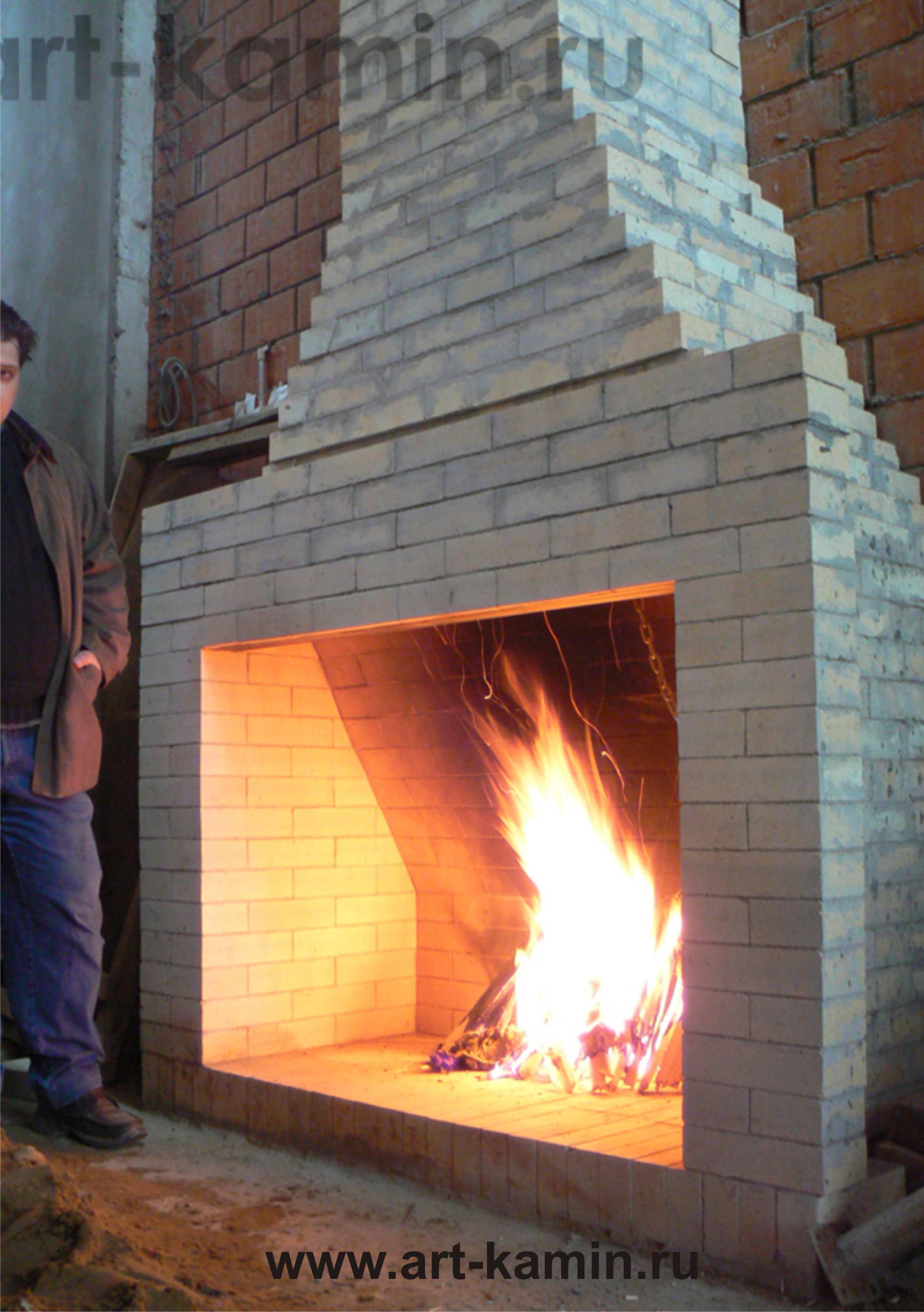 К сожалению нет фото. В то время я относился к своим работам более прохладно и не фотографировал, к тому же, цифровых фотоаппаратов не было. Вот один из больших каминов прошлого года. Топливник 1,1х0,8м, труба сендвич 300мм.
