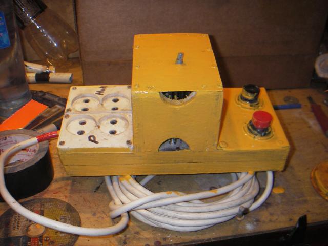 Вышеупомянутый ножной выключатель. Использовал симисторный регулятор мощности на 2.5 квт, купленный в магазине Чип и Дип за 1110 руб. И пускатель на 4 контакта. Одна розетка напрямую 220в через пускатель, другая - через реулятор и пускатель.